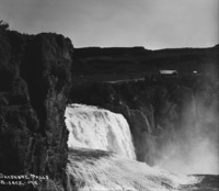 PC-2173 "Shoshone Falls;" close-up view from the north side of the canyon, power lines and outbuildings can be seen on the south side.