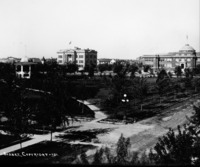 PC-2164 "Twin Falls - The Magic City;" aerial view of the City Park and gazebo (band stand). People, possibly students, gather in the Park near the school. Also visible: Methodist Church; Twin Falls County Court House; Justamere Inn, Twin Falls High School; Lincoln School in background. Photo taken from the Benoit Apartments.