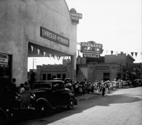 PC-2397 People line up along the street in front of the Barnard Auto Co (Chrysler-Plymouth). and the Bisbee Studio, as if waiting for a parade. Also visible is the Superior Grocery.