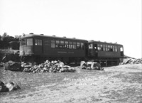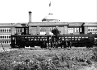 PC-2390 Two cars of the Twin Falls Electric Railway, parked behind the Twin Falls High School, with several men posing with the train.