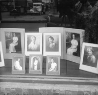 PC-2396 Window display of studio portraits of women, likely at the Bisbee Studio. Window reflection shows a truck and automobile (car).