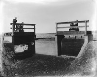 S 018 Two canal gates; a man stands atop one in the process of being opened.