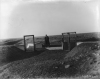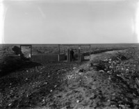 S 012 Wide view of a dry canal bed. A man stands inside the bed in center background; gates are to left.