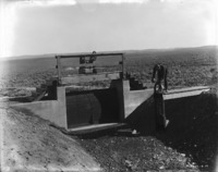 S 015 A man looks into a concrete intake gate in an irrigation system. A house and outbuildings are in the background.