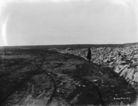 S 005 A man (possibly Bisbee) stands in a dry canal bed among several gates from a reservoir. Bisbee's photograph box in the foreground.