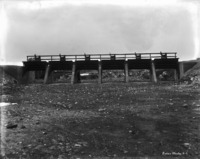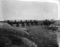 S 009 A two-horse buggy stands on a low bridge above a dry streambed or canal amidst the sage brush. A man stands beneath the bridge.