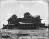 B 028 "North Side Inn. Jerome, Idaho;" a couple of men working on the construction of the Inn {located on the NW corner of Main and Lincoln Streets}.