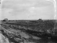 B 022 "One Year from Sage Brush. North Side" looking across a fenced field at a small farmstead, with house, barn, and other outbuildings