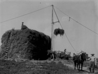 1998 "Haying on the Mark Bennett Ranch. One mile south of Twin Falls, Idaho, W.T. Seal, Overseer;" four men stacking hay with a horse and derrick.