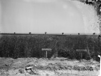 1966 A grain field; labeled signs describe the varieties, including "Gold Coin Wheat Winter " and "Gold Coin Wheat April 7."
