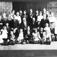 - A photo taken of another photo of a group of people of widely diverse ages. The embossed photo card reads, "Brown; St. Joseph, Mo."