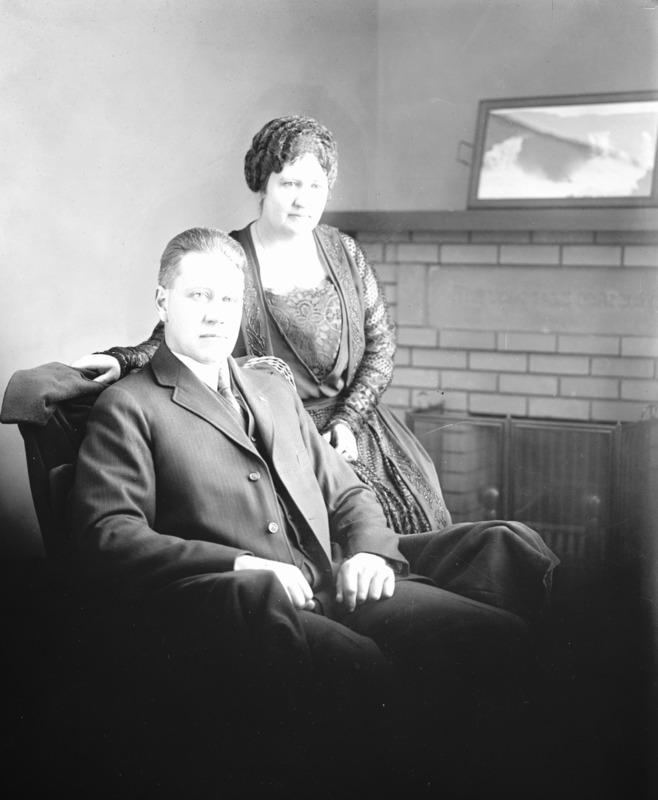 - Portrait of a couple, fireplace in the background.