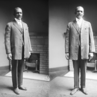 - Two portraits of a man in a suit, fireplace in background.