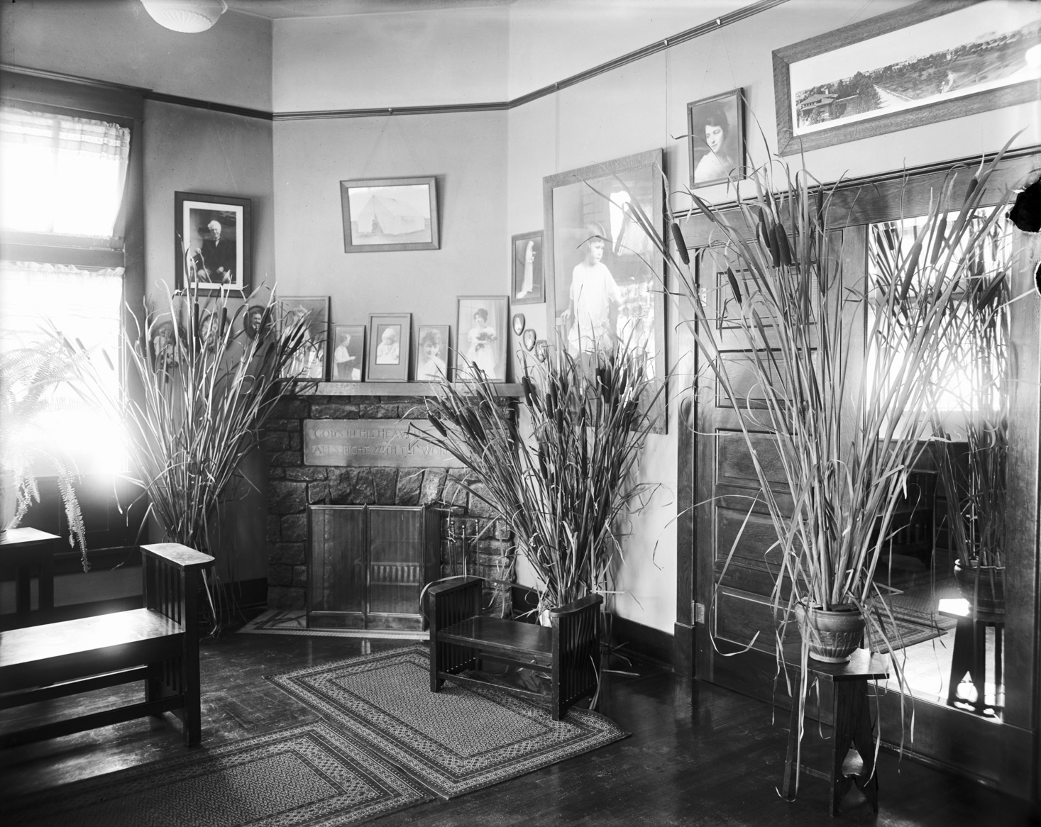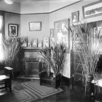 - Interior of Bisbee Studio. Cattails in vases, fireplace and framed photos visible.