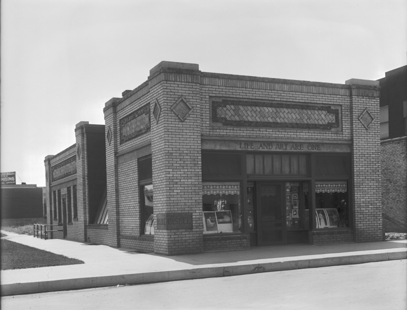 - The exterior of the Bisbee Studio before addition, looking at the front and the side along 2nd Ave E. Bisbee's motto, "Life and Art Are One" is visible above the entrance. Campbell Home Plumbing and Heating Company sign in background.