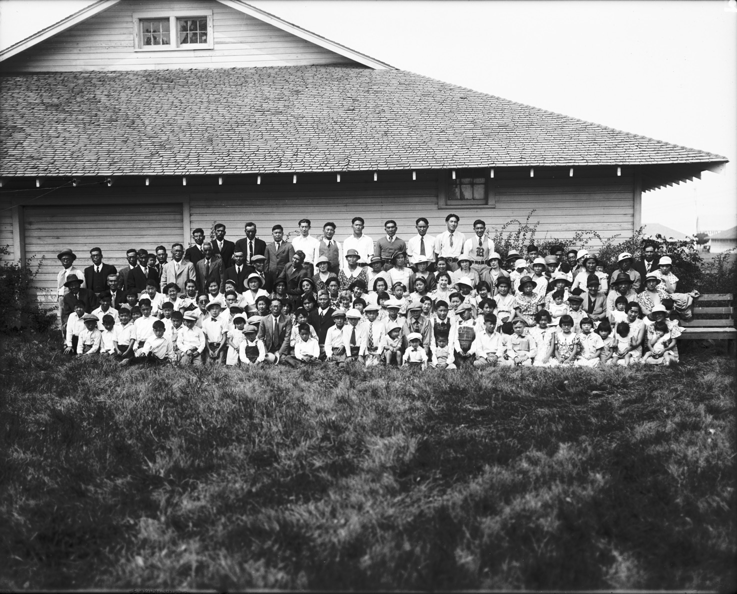 - Portrait of a large group of Japanese-Americans of all ages in front of a large building, possibly at the Fair grounds.