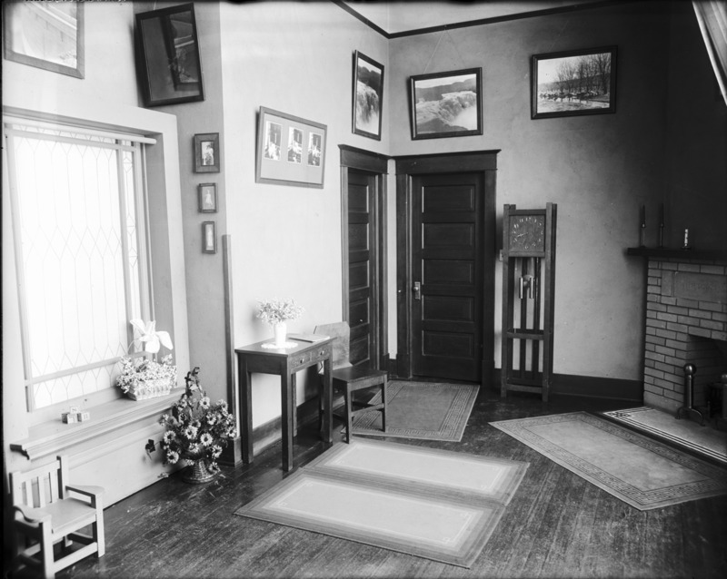 - Interior of Bisbee Studio; room has fireplace, framed photos, and photo props.