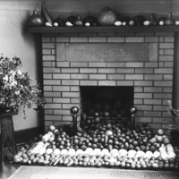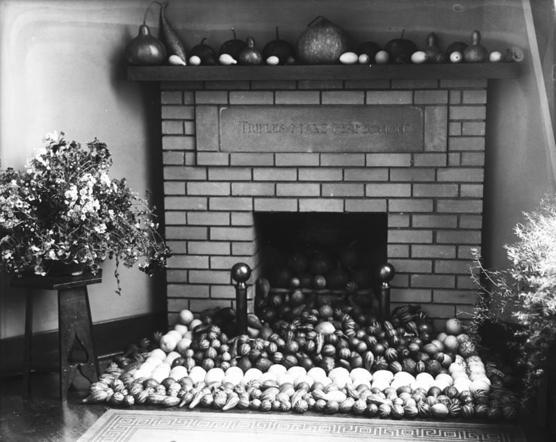 - Autumn display of gourds in front of one of the fireplaces in the Bisbee Studio. An embedded epigraph reads, "Trifles Make Perfection."
