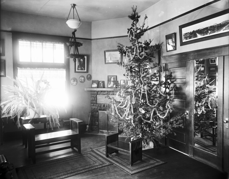- Interior of the Bisbee Studio; main room decorated with Christmas tree.