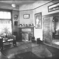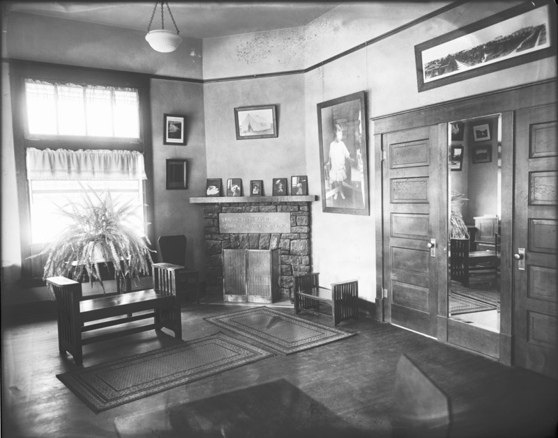 - Interior of the Bisbee Studio; main room with fireplace.