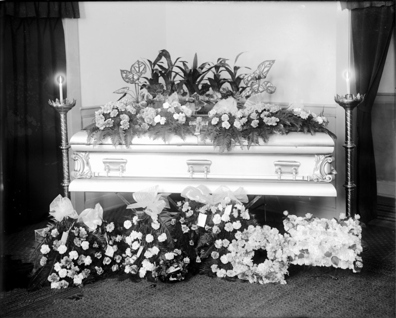 - Coffin surrounded by flowers and two large candlesticks.