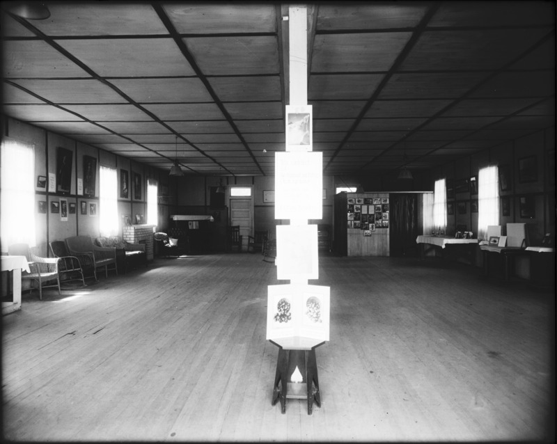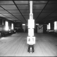 - Interior of the Bisbee studio; room with framed photos hung on walls and on tables, a display is featured on a column in the center of the photograph.