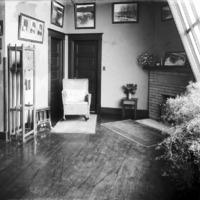- Interior of the Bisbee Studio, with a fireplace, slanted windows, and grandfather clock.