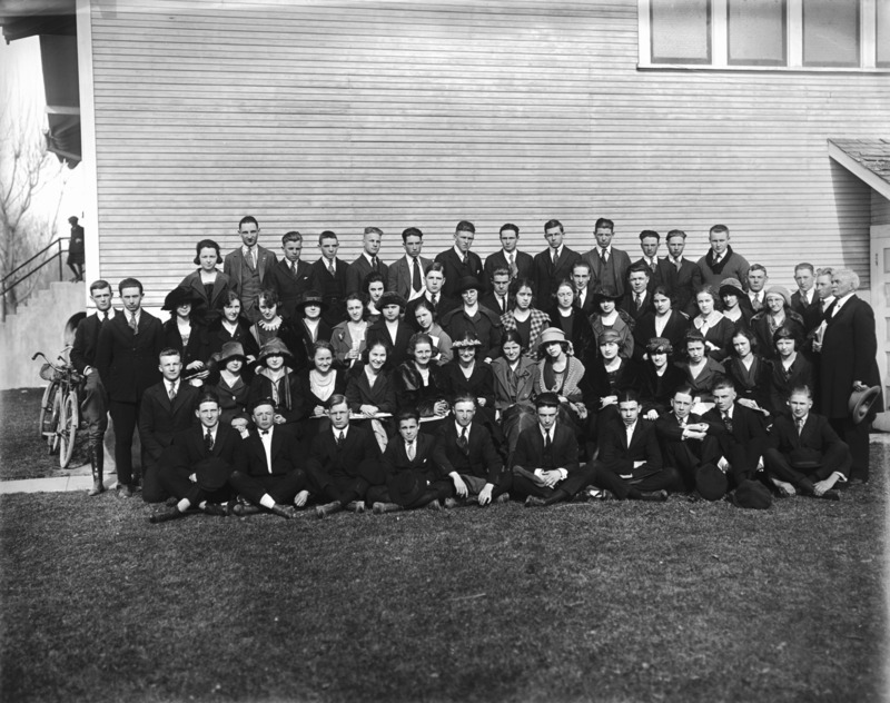 - Large group of mostly young people posed in front of the original First Christian Church.