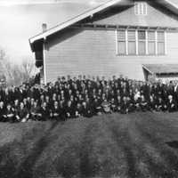 Large group of men posed in front of the original First Christian Church. The Methodist Church can be see in the background at left.