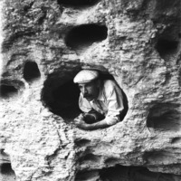 - Clarence Bisbee looking through a hole in a rock canyon wall.