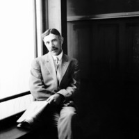 - Portrait of Clarence Bisbee seated on a window ledge in the Bisbee Studio.