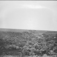 - Small valley with a homestead; a few scattered buildings in the distance.