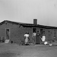 - Sod house; a man and three women, one with a bicycle, stand outside. A baby is seated in front of them.