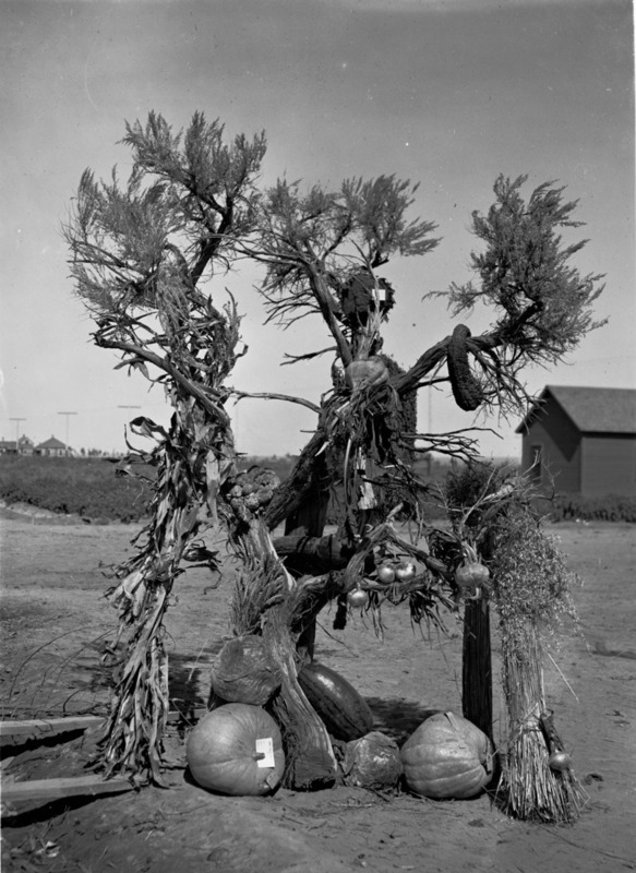- A large sagebrush draped with agricultural produce.