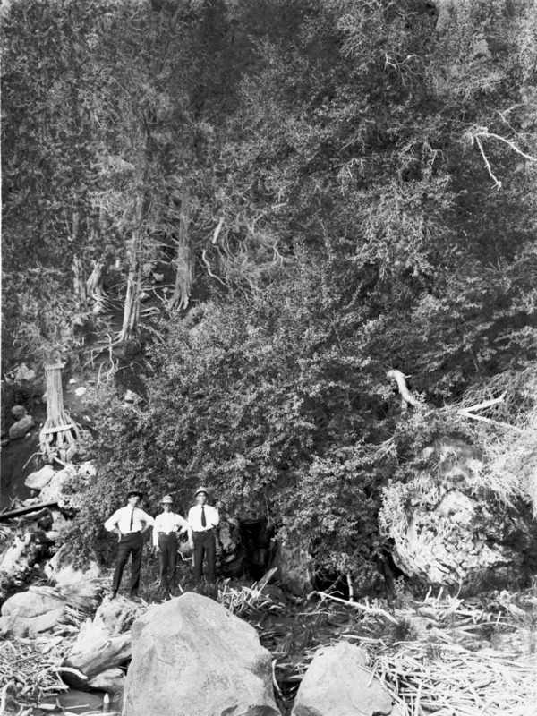 - Three men standing at the base of a steep incline covered with twisted trees.