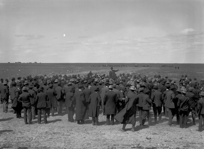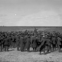 - A large group of men gathered around a speaker in a field; horses and/or cattle and a townsite in the distance.