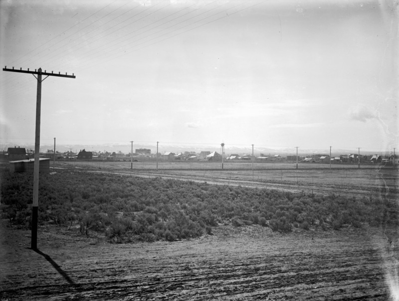 - A wide view of early Twin Falls, looking south, with a few power or phone lines visible. The large building on the center left is Bickel School under construction.