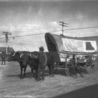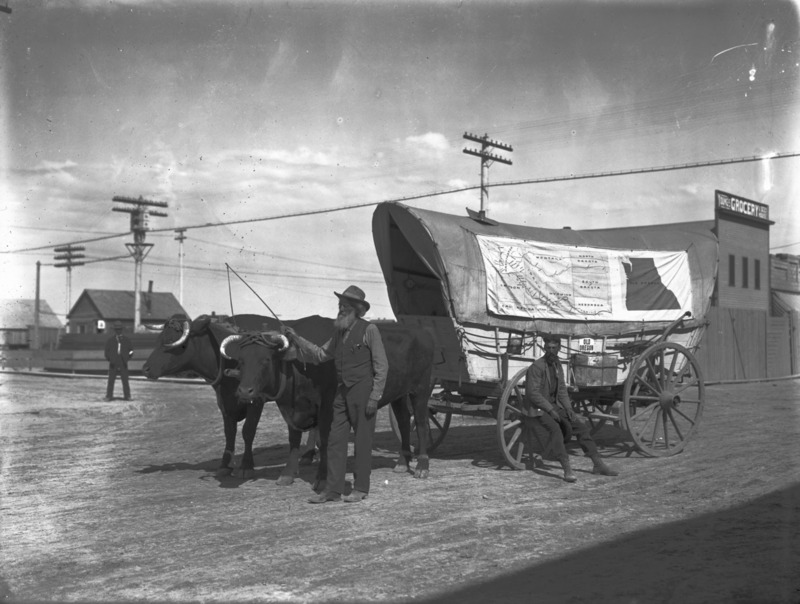 - Ezra Meeker, poses with his ox-team and wagon on his 1906 journey east along the original Oregon Trail. Young's Grocery is visible at right.