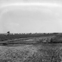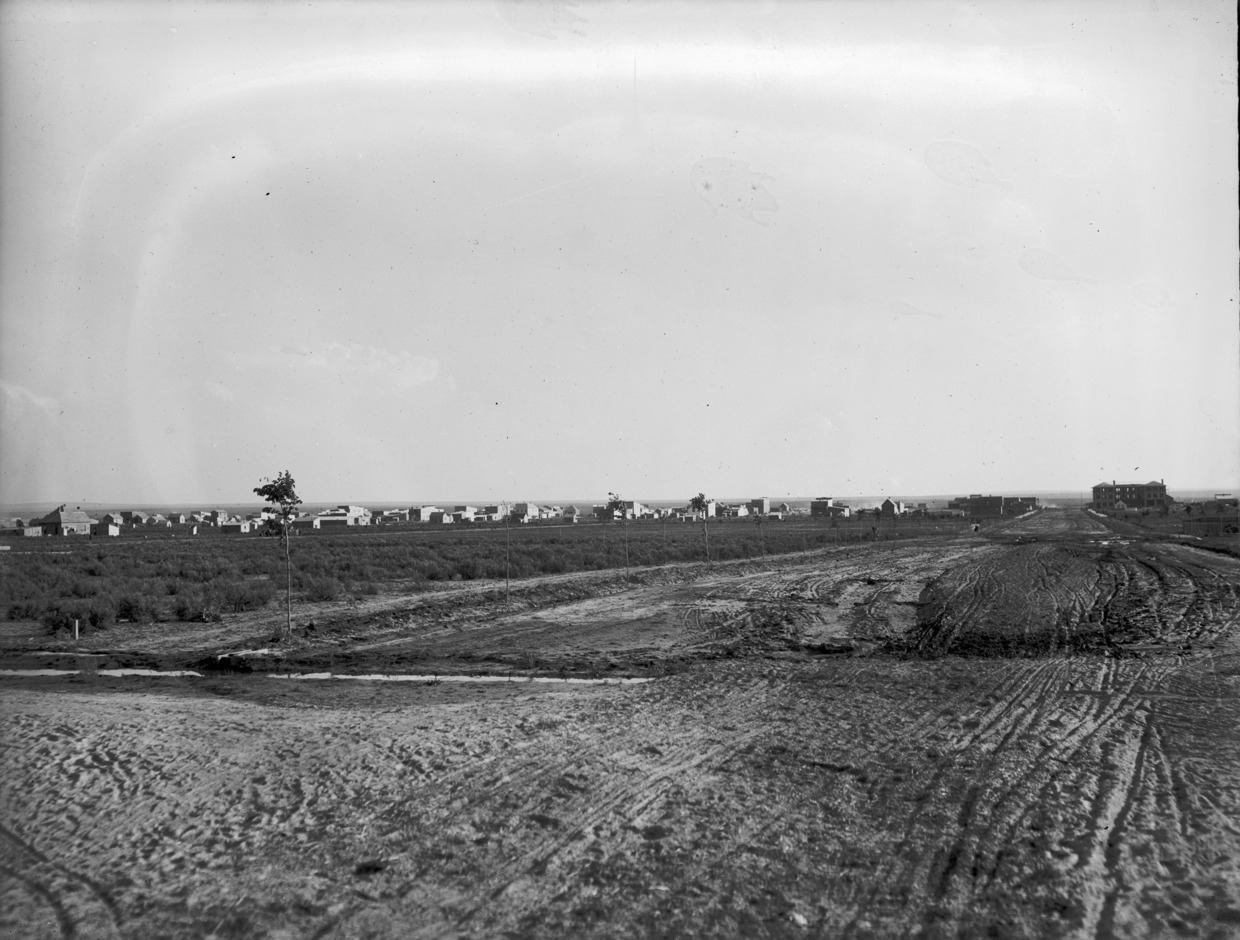 - A wide view down Shoshone St, looking southwest. On the left is City Park, with recently planted trees lining the street. The Perrine Hotel is in the background on right.