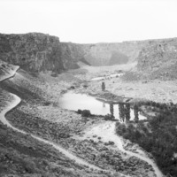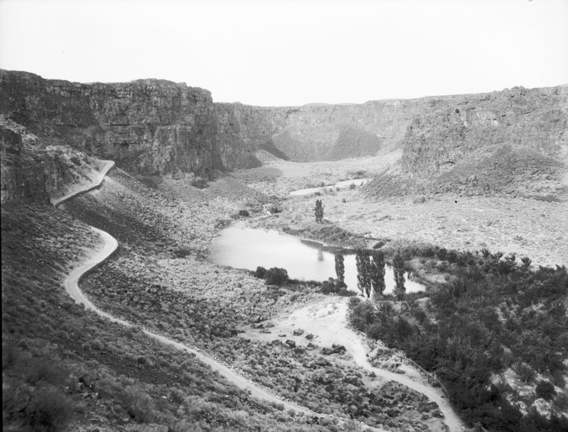 - View of Blue Lakes, with the road descending to the canyon floor.