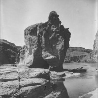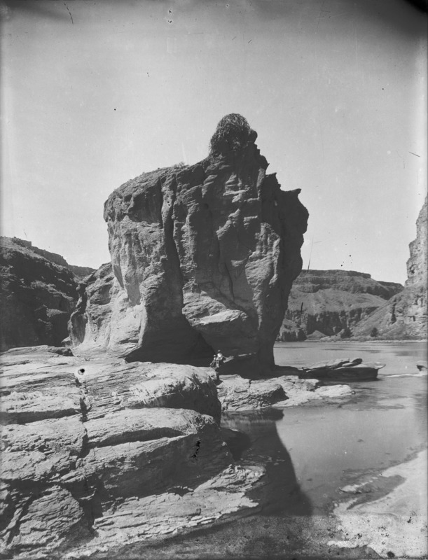- Two people sit at the base of one of the large rock formations at Pillar Falls.