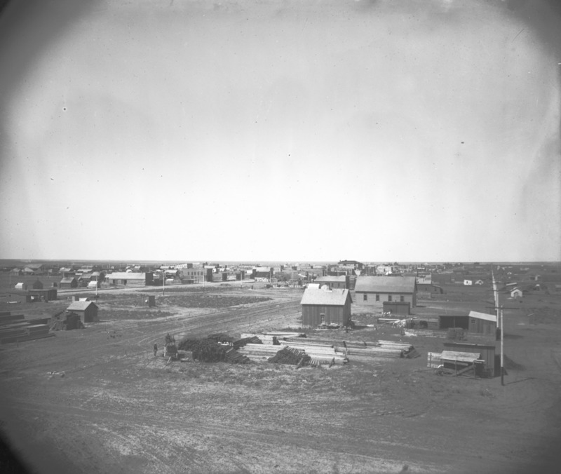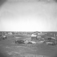 - A wide view of early Twin Falls townsite, looking west. The Hotel Perrine is in the middle background. Piles of lumber and a construction crew in the foreground.