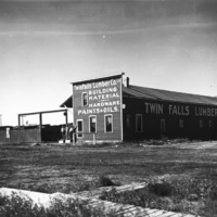 Twin Falls Lumber Company Ltd building and yard. Three men stand near the entrance. The front of the building reads, "Twin Falls Lumber Co, LTD; Building Material and Hardware; Paints and Oils.