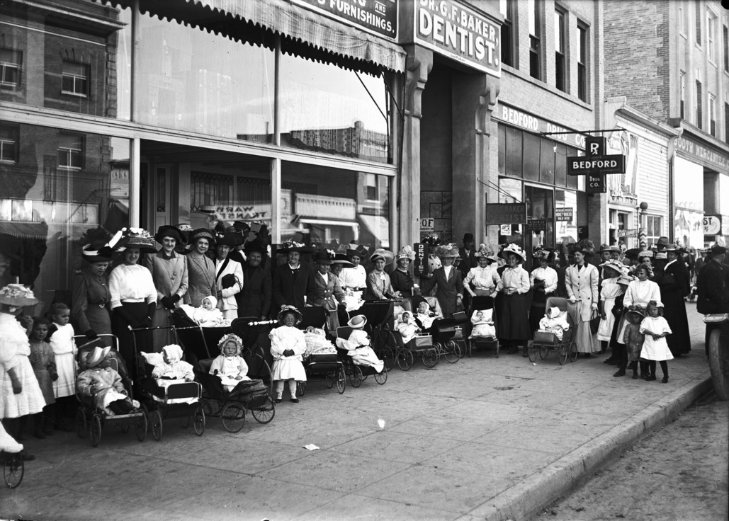 Women and children, including many babies in carriages pose in front of the Idaho Department Store building. Other businesses visible are the Booth Mercantile Co., Falls Steam Laundry, Bedford Drug Co., and G.F. Baker, Dentist. The reflection of the Rogerson Hotel can be seen in the window.