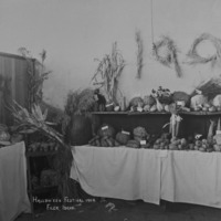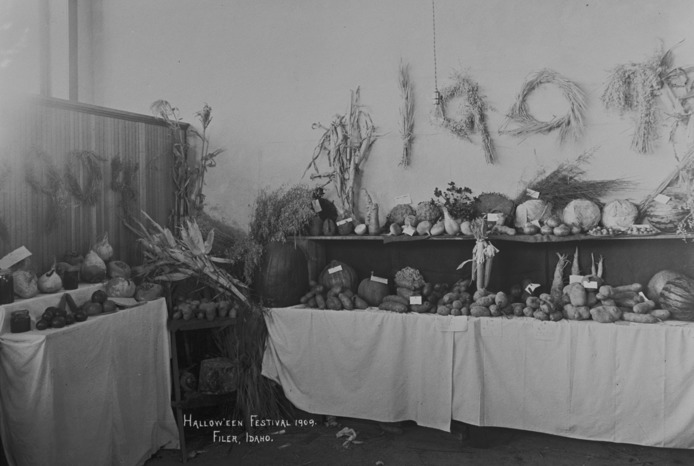 "Hallowe'en {Halloween} Festival, 1909. Filer, Idaho;" produce displayed on indoor tables