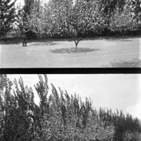 - Two photos of a man standing beside a flowering fruit tree.