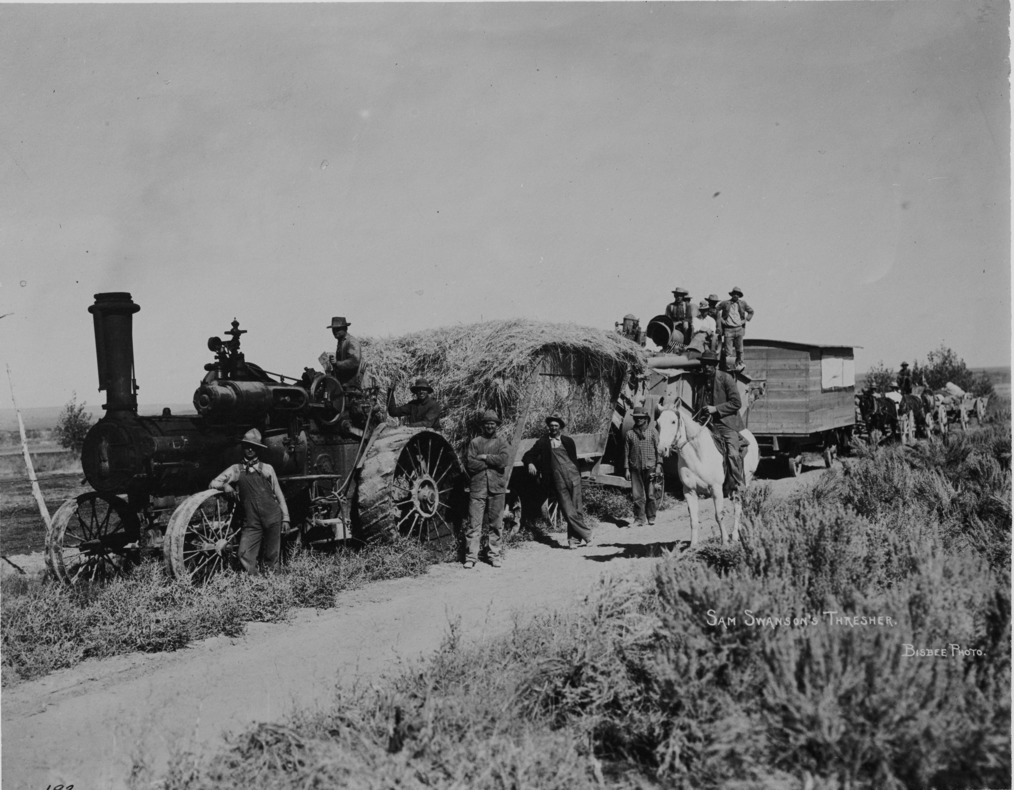 - "Sam Swanson's Thresher;" A group of men posing with steam engine thresher. Horses and wagons also seen.