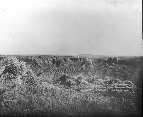 - "Wheat, 77 2/3 Bushels Per Acre. Schwamb Ranch. Turnipseed Brothers, Overseers, Twin Falls, Idaho;" Two men and a team of horses operating a reaper-binder in a wheat field.