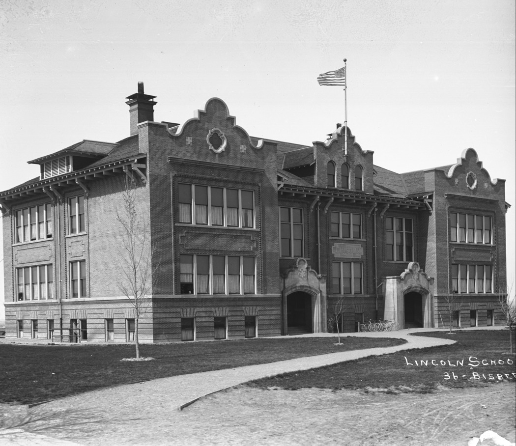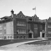 "Lincoln School;" with landscaping, soon after construction. {This building was demolished in 1975.}
