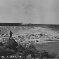 - "Milner Dam;" head gates; a man stands on a rock in the foreground. Ice covers some of the water.